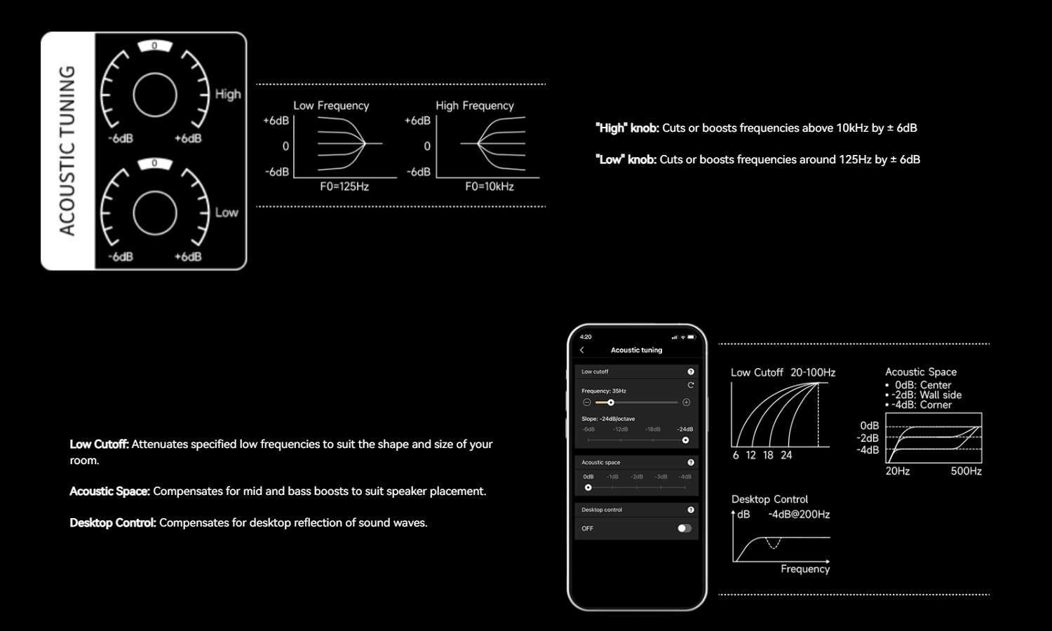 - Low 노브: 125Hz 부근 저음 ±6 dB