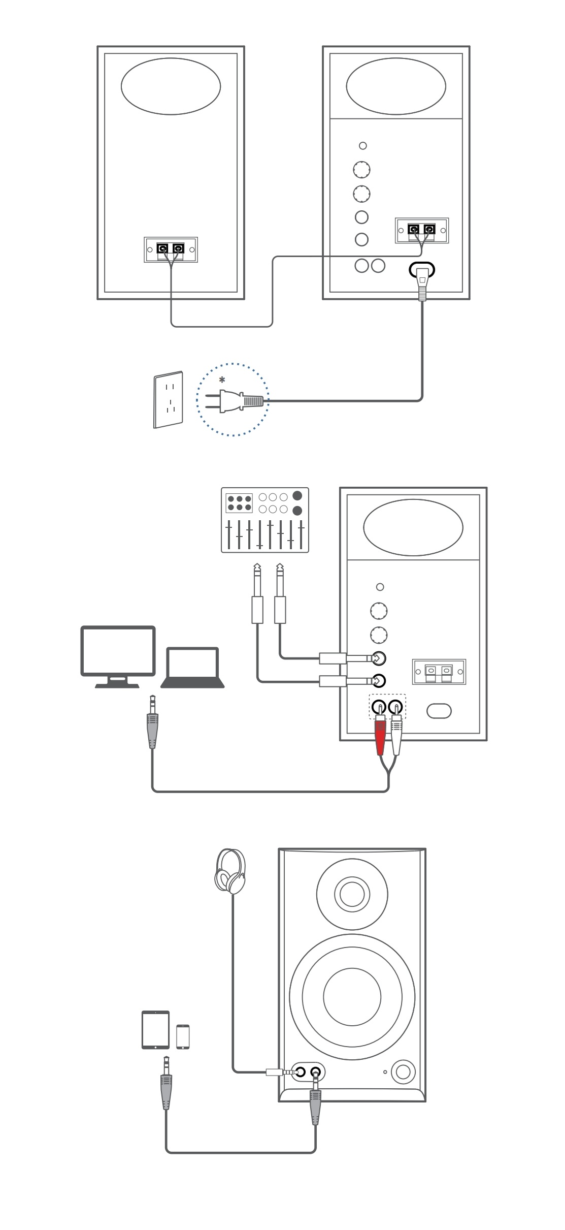 MR3는 액티브 + 패시브 스피커 세트와 기본 케이블, 전원선이 포함됩니다.